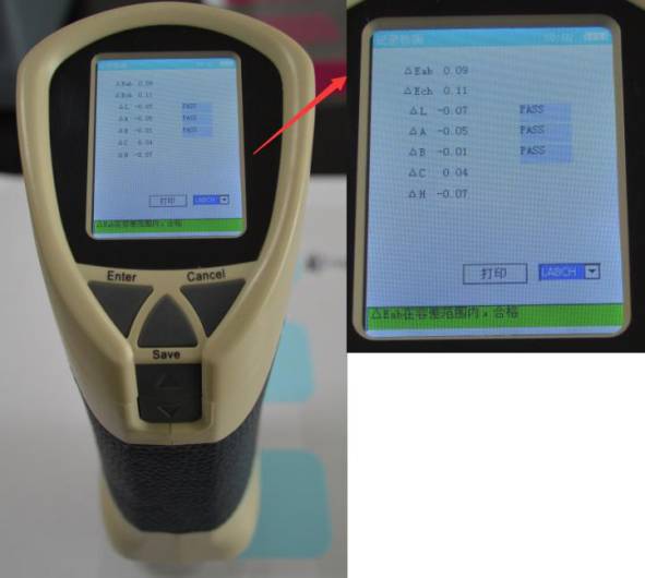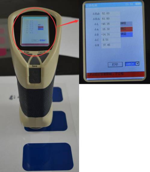 以彩谱CS-200为例,介绍色差测量过程。以下图中的三个颜色分别为标准样品、1号测试样、2号测试样,测量1号测试样、2号测试样与标准样之间的色差。